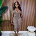 A curve-hugging halter jumpsuit with a deep V neckline and sleek, sculpting fit for an effortlessly bold look.