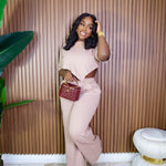 This matching set delivers laid-back elegance with a modern twist. The short sleeve crop top pairs effortlessly with flowy wide leg pants for a comfortable yet elevated everyday look.